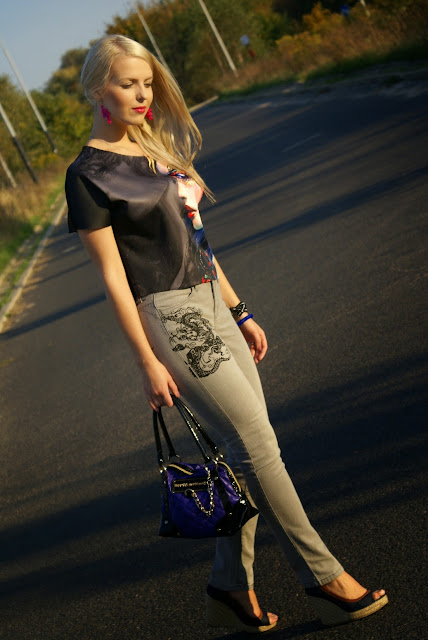 Do tego jasnoszare jeansy z czarnym, przyciągającym wzrok, wzorem i fioletowa torebka na krótkich rączkach prosto ze Stanów od rapera Nelly'ego (marka Apple Bottoms)!