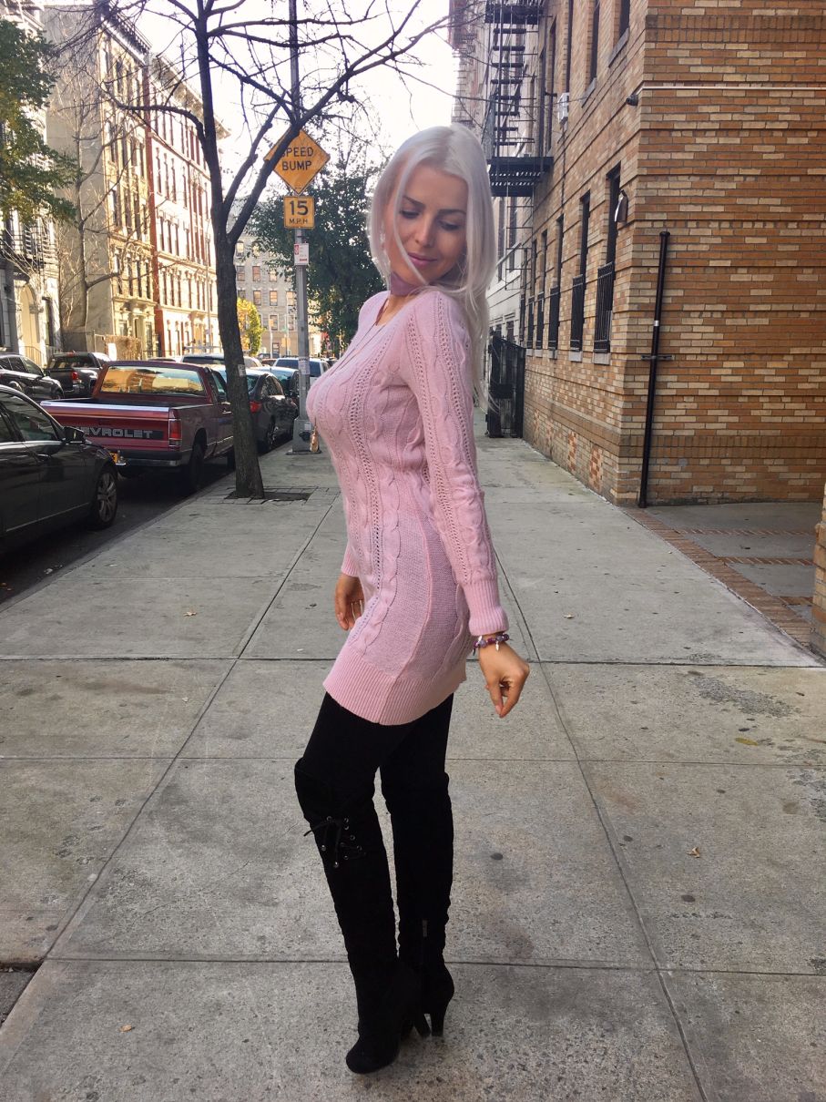 Today I would like to present you another fashion post straight from New York City! This time it will definitely be one of the cutest versions of myself, with a light pink knitted long sweater/dress as the main element of the outfit, but with a pair of black sexy knee-high boots and a black fitted coat with some leather elements.