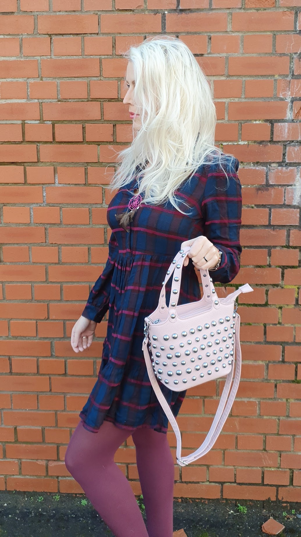 Today I would like to present you an Autumn-themed outfit, which is both classy and casual and consists of: a teal-coloured, checkered, buttoned shirt dress with flare at the bottom, berry tights, beige ankle boots with openwork elements and wooden heel, and some accessories: a baby pink studded mini bag, and a handmade jewellery set with a dreamcatcher theme.